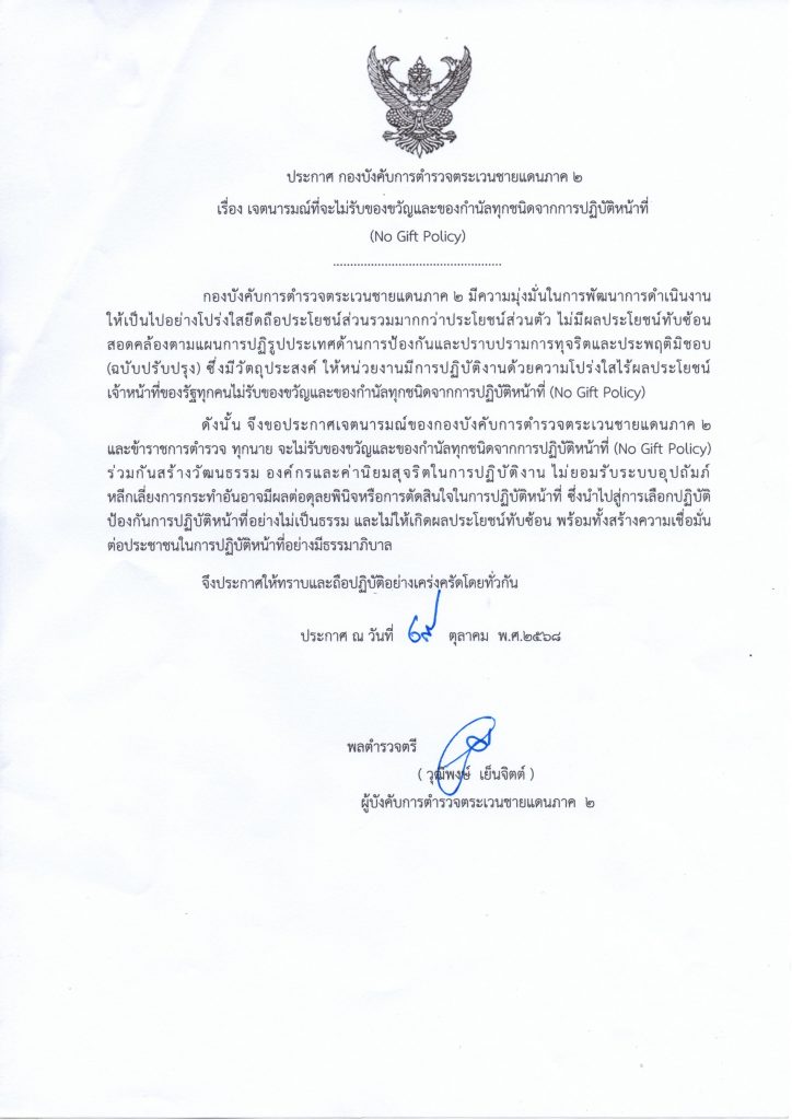 ข่าว ภารกิจประกาศ บก.ตชด.ภาค 2 มีเจตนารมณ์ที่จะไม่รับของขวัญและของกำนัลทุกชนิดจากการปฏิบัติหน้าที่ (No Gift Policy) 26 มกราคม 2024 watcharin จำนวนผู้เข้าชม : 789