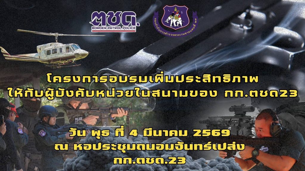 พล.ต.ต.วุฒิพงษ์ เย็นจิตต์ ผบก.ตชด.ภาค 2 เป็นประธานในพิธีเปิดโครงการอบรมเพิ่มประสิทธิภาพให้กับผู้บังคับหน่วยในสนามของ กก.ตชด.23 โดยมี ว่าที่ พ.ต.อ.ธีรศักดิ์ โพธิ์ศรีมา ผกก.ตชด.23 , พ.ต.ท.เบญจรงค์ ใบใหญ่ รอง ผกก.ฯ (4) , พ.ต.ท.อนุสรณ์ แสนสิ่ง รอง ผกก.หน.กองร้อย ตชด.235 , พ.ต.ท.พชรเดช ไชยทะ ครู(สบ.3) กก.ฯ , สว. , ผบ.ร้อย ฯ และผู้เข้าร่วมอบรม ร่วมให้การต้อนรับ โดยมีเป้าหมายในการอบรมฯ เพื่อเพิ่มขีดความสามารถในการปฏิบัติงานให้กับ ผบ.หน่วยในสนาม มีผู้เข้ารับการอบรมฯ จำนวน 55 นาย โดยได้รับเกียรติจาก พ.ต.อ.เพิ่มศักดิ์ ตาตะนันทน์ รอง ผบก.อก. บช.ตชด. , พ.ต.อ.วุทธยา สิงห์กิ้ง รอง ผบก.ตชด.ภาค 4 , ว่าที่ พ.ต.อ.ธีรศักดิ์ โพธิ์ศรีมา ผกก.ตชด.23 และ พ.ท.ทิวกร ดอนศรีชา ผช.หน.ฝยก.- ขว. กกล.สุรศักดิ์มนตรี เป็นวิทยากร บรรยายให้ความรู้ ณ ห้องประชุมถนอม จันทร์เปล่ง กก.ตชด.23 อ.เมือง จว.สกลนคร